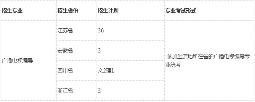 2020年,廣播電視編導專業面向江蘇省、安徽省、四川省、浙江省招收本科生45名,學制4年。