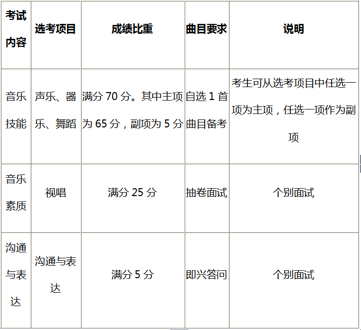 3、考試內(nèi)容:包括音樂技能、音樂素質(zhì)、溝通與表達能力共3個方面,總分100分。