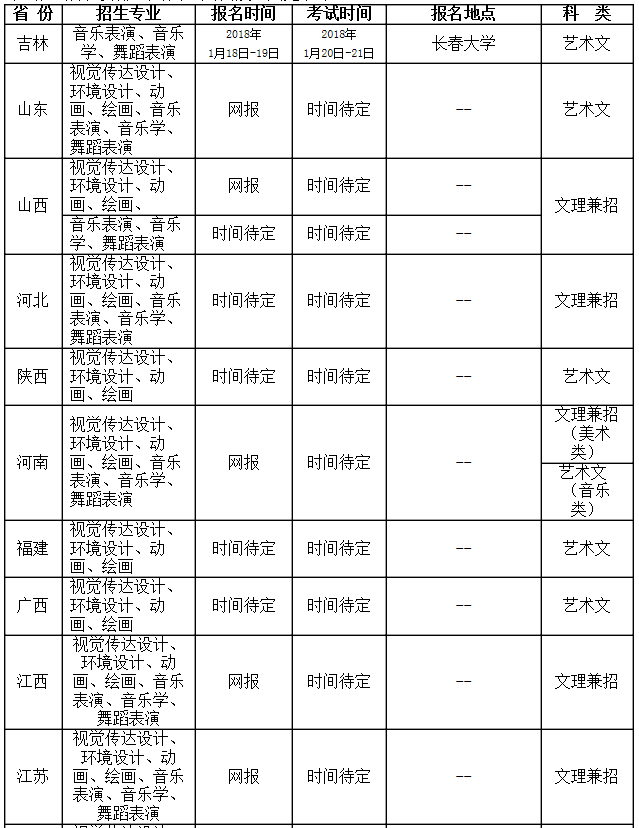 美術(shù)類專業(yè):山東、山西、河南、河北、江蘇、江西、陜西、甘肅、福建、廣西、吉林(吉林籍考生使用省專業(yè)統(tǒng)考成績)。