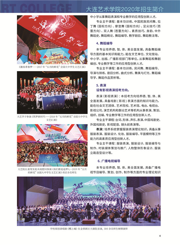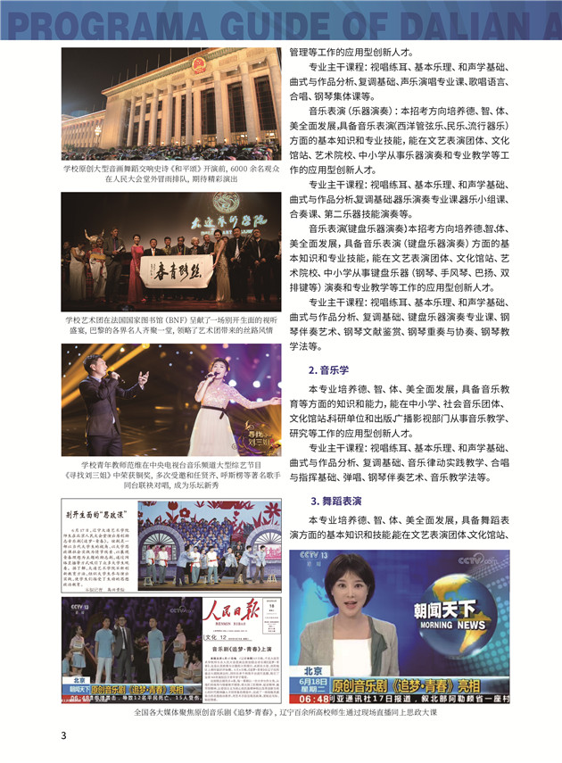 學校構建了以劇目創作為基礎的“學、練、創、演、賽”一體化的藝術實踐教學體系。學校與中央廣播電視總臺及遼寧電視臺共建實習實訓平臺,師生們經常性參加央視和遼寧衛視主辦的國家重大節慶晚會節目的錄制、采編、導播和演出等頂崗實習實訓工作;獲批省級實踐教學示范中心2個、省級校外實踐教學基地6個。近年來,持續打造了系列大型原創劇目——“和平三部曲”(清唱劇《湯若望》《櫻之魂》、交響音舞詩畫《和平頌》)、舞臺劇《絲路•青春》先后登上國家大劇院和人民大會堂的舞臺。作為新中國成立70周年和紀念五四運動100周年的獻禮劇目,思想政治理論課原創音樂劇《追夢•青春》在大連、沈陽和北京人民大會堂成功上演,通過舞臺演出與網絡直播創造了遼寧省100多所高校師生100余萬人在線同上一堂思政大課的盛況。人民日報、新華社、光明日報、經濟日報、遼寧日報、中央廣播電視總臺、遼寧電視臺等100多家媒體進行了報道,社會影響廣泛。