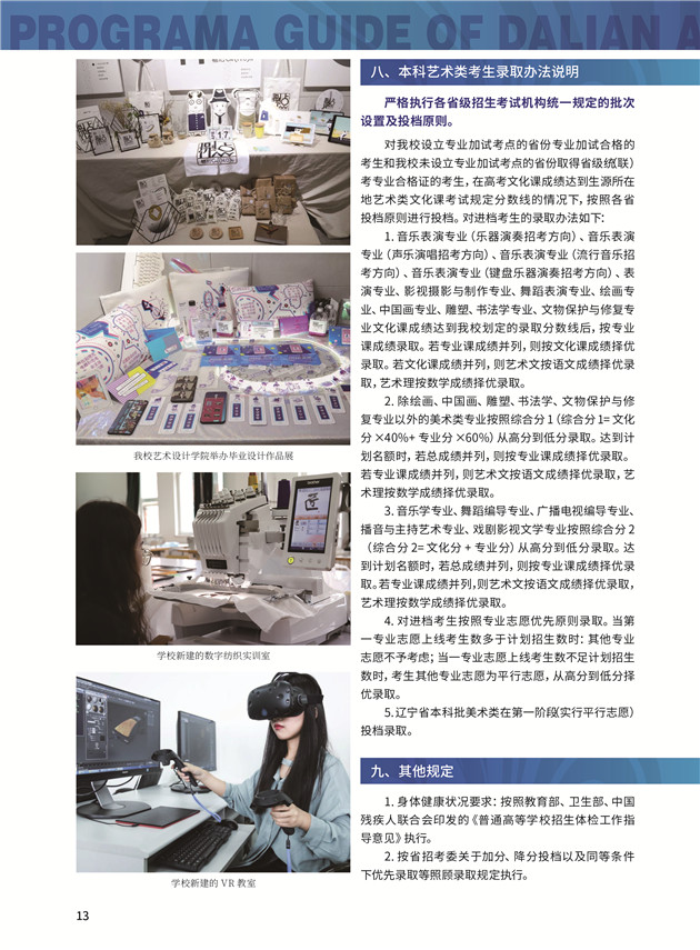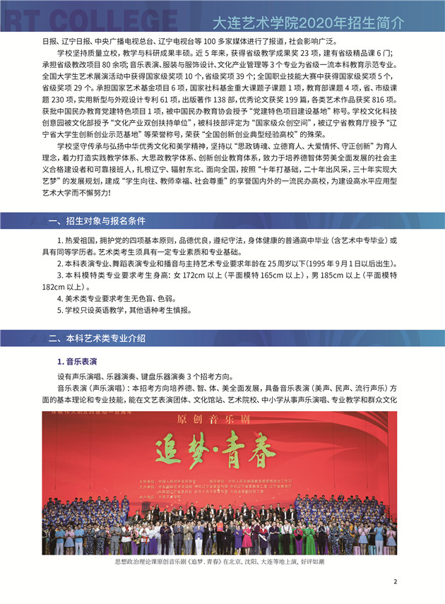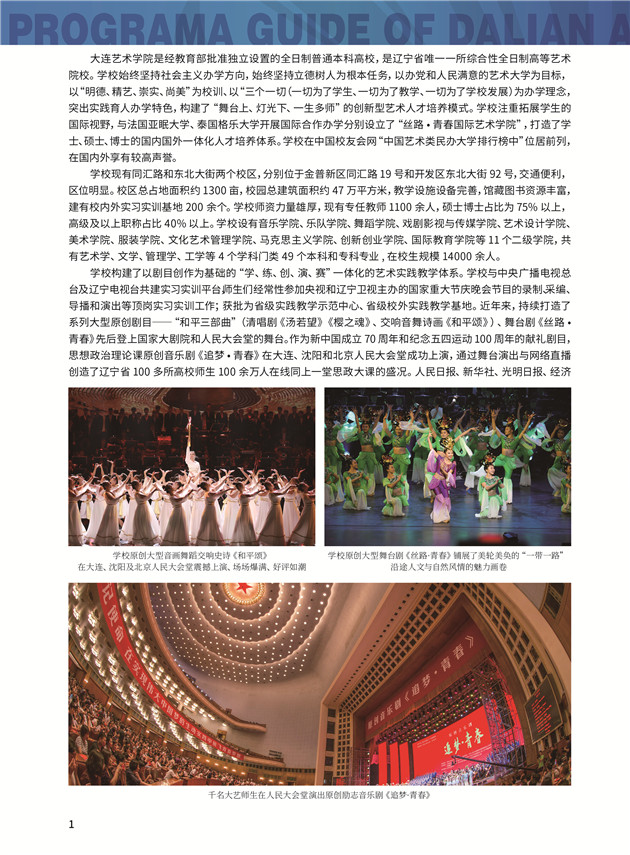 大連藝術學院是經教育部批準獨立設置的全日制普通本科高校,是遼寧省唯一一所綜合性全日制高等藝術院校。學校始終堅持社會主義辦學方向,始終堅持立德樹人為根本任務,以辦黨和人民滿意的藝術大學為目標,以“明德、精藝、崇實、尚美”為校訓、以“三個一切(一切為了學生、一切為了教學、一切為了學校發展)為辦學理念,突出實踐育人辦學特色,構建了“舞臺上、燈光下、一生多師”的創新型藝術人才培養模式。學校注重拓展學生的國際視野,與法國亞眠大學、泰國格樂大學開展國際合作辦學分別設立了“絲路·青春國際藝術學院”,打造了學士、碩士、博士的國內國外一體化人才培養體系。學校在中國校友會網“中國藝術類民辦大學排行榜中”位居前列,在國內外享有較高聲譽。