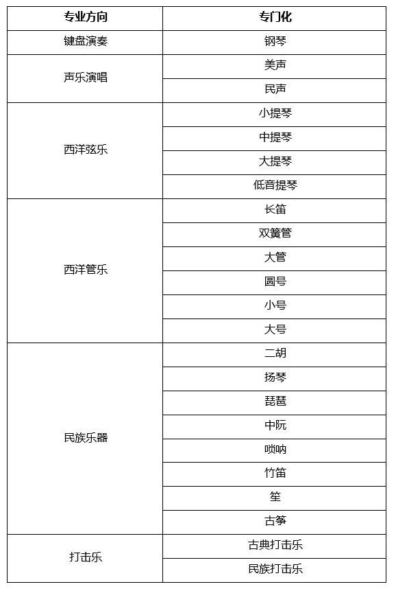 1.音樂表演專業(yè)辦學層次為本科,學制4年,外語語種為英語,學費標準為10000元/年。招生專業(yè)方向及專門化如下:
