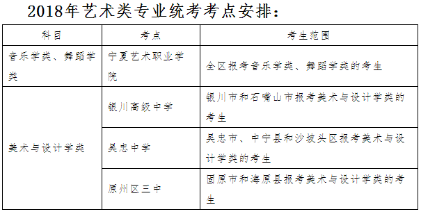 2018年普通高等學校招生藝術類專業統考音樂學類、舞蹈學類專業考點設在寧夏藝術職業學院(銀川市西夏區同心北街666號);美術與設計學類專業考點分片區集中進行,銀川市和石嘴山市的考生安排在銀川高級中學(銀川市興慶區清河北街海寶東路)考點參加美術與設計學類考試,吳忠市、中寧縣和沙坡頭區的考生安排在吳忠中學(吳忠市利通區吳忠汽車站東側500米)考點參加美術與設計學類考試,固原市和海原縣的考生安排在原州區三中(固原市原州區文化東街9號)考點參加美術與設計學類考試。