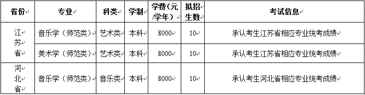江蘇省的美術(shù)學(xué)(師范類(lèi))、音樂(lè)學(xué)(師范類(lèi))專(zhuān)業(yè),河北省的音樂(lè)學(xué)(師范類(lèi))專(zhuān)業(yè)錄取原則: 承認(rèn)考生所在省相應(yīng)專(zhuān)業(yè)統(tǒng)考成績(jī),進(jìn)檔考生按省統(tǒng)考成績(jī)由高分到低分錄取。統(tǒng)考成績(jī)相同時(shí),優(yōu)先錄取高考文化成績(jī)高者。