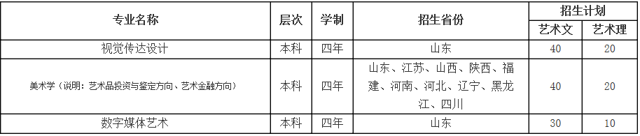 注: 報考我校藝術(shù)類專業(yè)考生須參加省美術(shù)類專業(yè)統(tǒng)考,我校不單獨組織校考,專業(yè)成績直接使用省美術(shù)類專業(yè)統(tǒng)考成績。美術(shù)學(xué)(說明:藝術(shù)品投資與鑒定方向、藝術(shù)金融方向)專業(yè)在江蘇、山西、陜西、福建、河南、河北、遼寧、黑龍江、四川等9個省份文理科招生計劃總數(shù)為20人。學(xué)費按山東省政府主管部門規(guī)定的收費標(biāo)準(zhǔn)執(zhí)行。