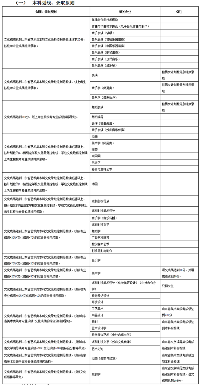 按照教育部及山東省有關規定,我校為獨立設置的本科藝術院校,可自行劃定文化錄取控制分數線。