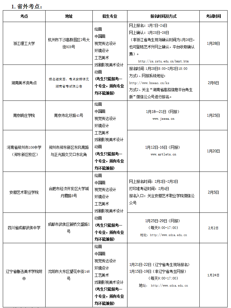 l 湖南、江蘇、安徽、河南省份考點,僅允許本省考生參加考試。未設美術類考點省份的考生可選擇到浙江、四川、遼寧任一考點參加考試。