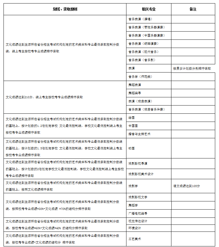 按照教育部有關文件規定,我校為獨立設置的本科藝術院校,可自行劃定文化錄取控制分數線。如有部分省份要求文化錄取控制線不得低于當地藝術類最低文化控制線,按各省份文件規定執行。