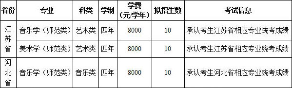 江蘇省的美術學(師范類)、音樂學(師范類)專業,河北省的音樂學(師范類)專業錄取原則:承認考生所在省相應專業統考成績,進檔考生按省統考成績由高分到低分錄取。統考成績相同時,優先錄取高考文化成績高者。