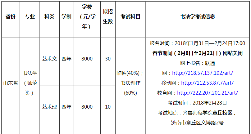www.qlnu.edu.cn)公布考生成績,合格考生于4月底前網上下載、打印《齊魯師范學院2018年藝術類專業考試合格證》,學校不再單獨寄發。專業考試不合格者,不另行通知。