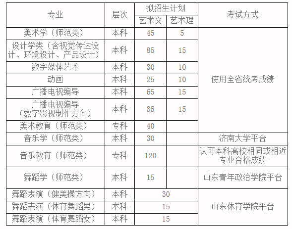 注:文理兼招的專業(yè)依據(jù)藝術(shù)文、理合格人數(shù)分列文理計劃。最終招生專業(yè)及計劃以山東省教育招生考試院公布為準。