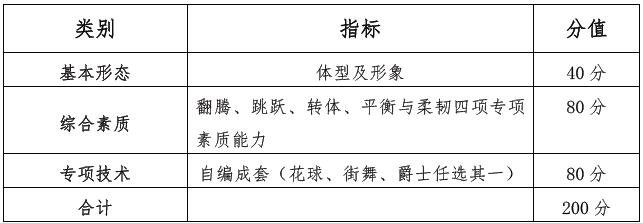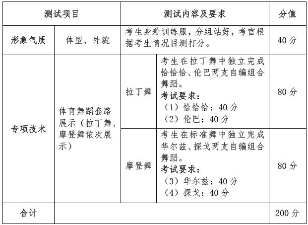 各科滿分100 分,總分200 分。各科采用面試形式,各分項按百分制評分,總分=(形體條件×15%+基本功×20%+自選技巧×15%+舞蹈劇目表演×30%+即興表演×20%)×2。
