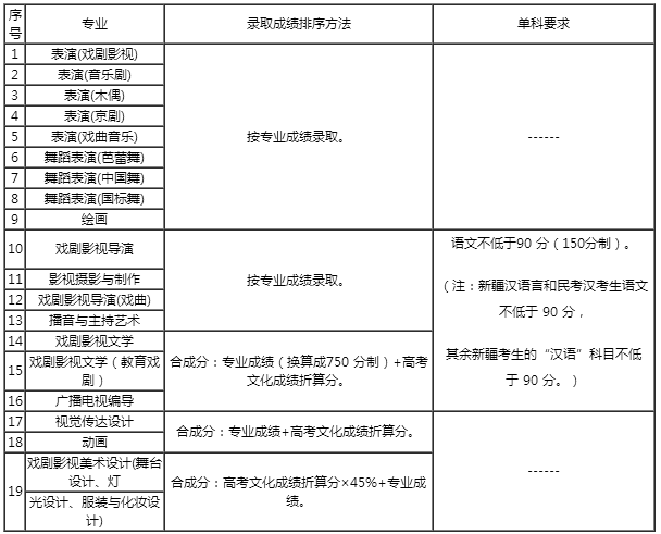 (四)關于計劃科類:表演(戲劇影視、音樂劇)按教育部批準的分省市分專業計劃錄取,各專業方向內不分文理,統一排序、計劃共用。其他??紝I(方向)不分文理,全國統招。