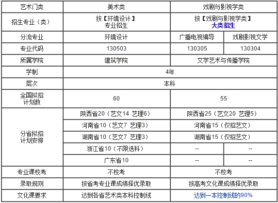 長安大學2017年藝術類共招收【環境設計】和【戲劇與影視學類(含廣播電視編導和戲劇影視文學)】2個專業(類)。