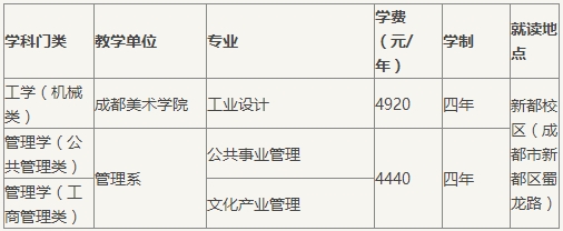 1.普通本科專業(公共事業管理、文化產業管理、工業設計):在考生思想政治品德考核及體格檢查合格和文化成績達到四川省最低控制分數線的情況下,對符合我院投檔比例和成績要求的進檔考生,錄取時根據專業志愿優先原則,按高考成績從高分到低分,德、智、體全面考核,擇優錄取。