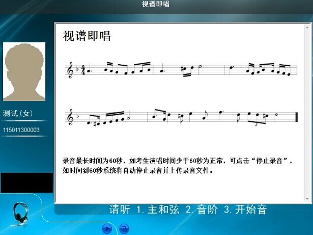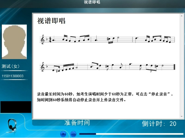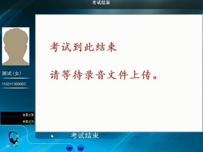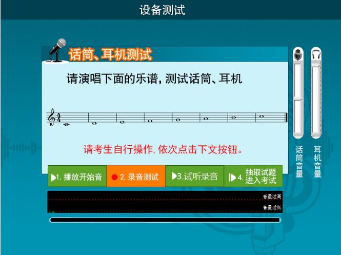 2.錄音測試:在聽到“開始錄音”的語音提示后,考生對準話筒錄入測試音。當音量過高或過低時,系統會提示需重新錄音??忌烧{節適當調整話筒音量和耳機音量。