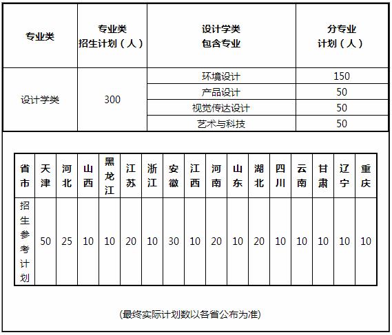 說明:當(dāng)我校“綜合成績”計算方法與生源所在省、自治區(qū)、直轄市計算方法沖突時,按生源所在省計算方法為準(zhǔn)。學(xué)校錄取時按專業(yè)類(設(shè)計學(xué)類)錄取,最終解釋由省招生主管部門和學(xué)校招生辦公室負(fù)責(zé)。