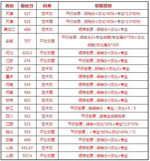 4、文化課高考成績達(dá)到考生所在省、自治區(qū)、直轄市藝術(shù)類本科錄取投檔分?jǐn)?shù)線及以上;