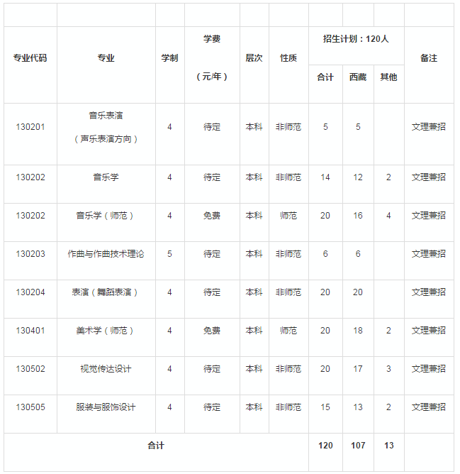 ⑴報考我校音樂學、舞蹈表演、兩個專業的考生按照2018年西藏自治區藝術類省級統考成績為據進行錄取。