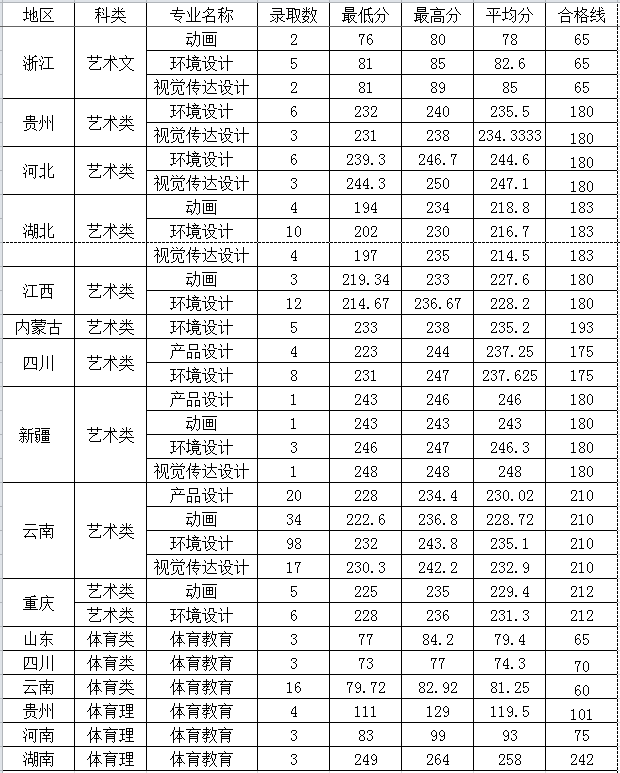 2016年西南林業大學全國各省份藝術類體育類錄取情況表